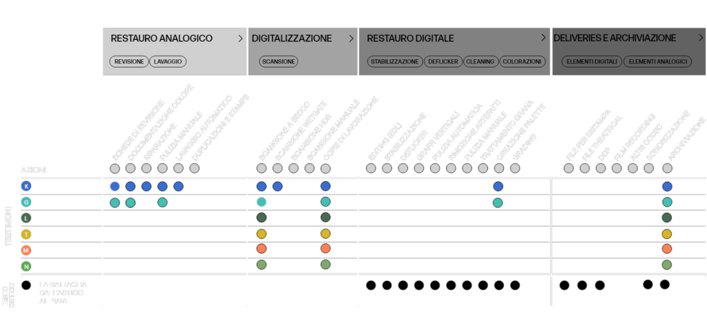 La presente sezione intende quindi documentare in dettaglio ogni fase e azione di revisione, restauro, ecc, condotta sui singoli elementi prima (durante il restauro analogico e la digitalizzazione) e sui materiali selezionati nel montaggio finale poi in termini di restauro digitale in senso stretto e di produzione di copie conservative e di accesso.