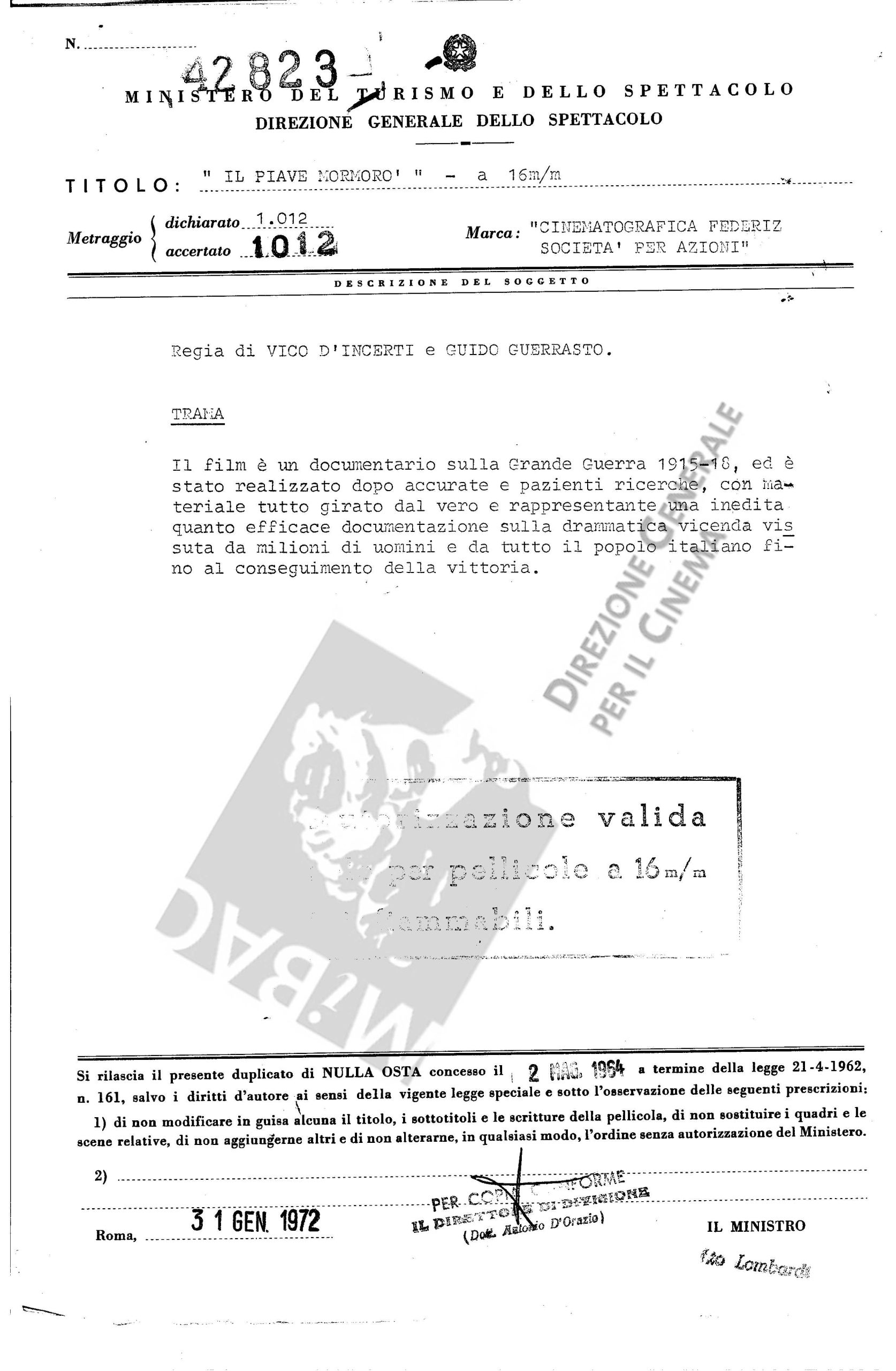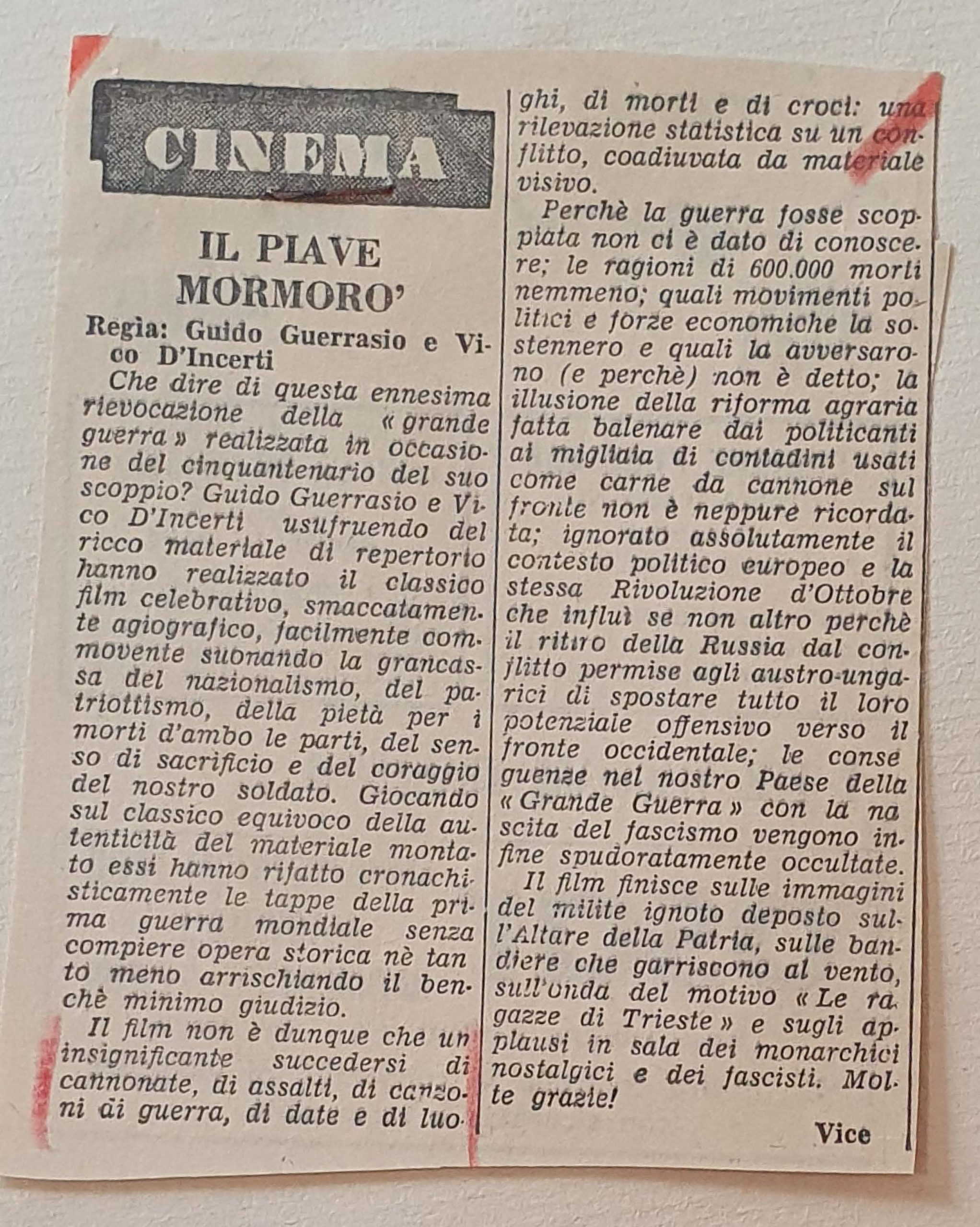 (Astor) Pochi giorni fa Guido Aristarco lamentò, in queste colonne, che il nostro cinema mancasse di un «vero» film sulla guerra 1915-18. Si potrebbe dire che Il Piave mormorò…, in sede cronachistica, quale rievocazione documentaria, riempie quel vuoto, fornendo una salda traccia per il futuro e augurabile regista che toglierà a interpretare storicamente quella guerra.